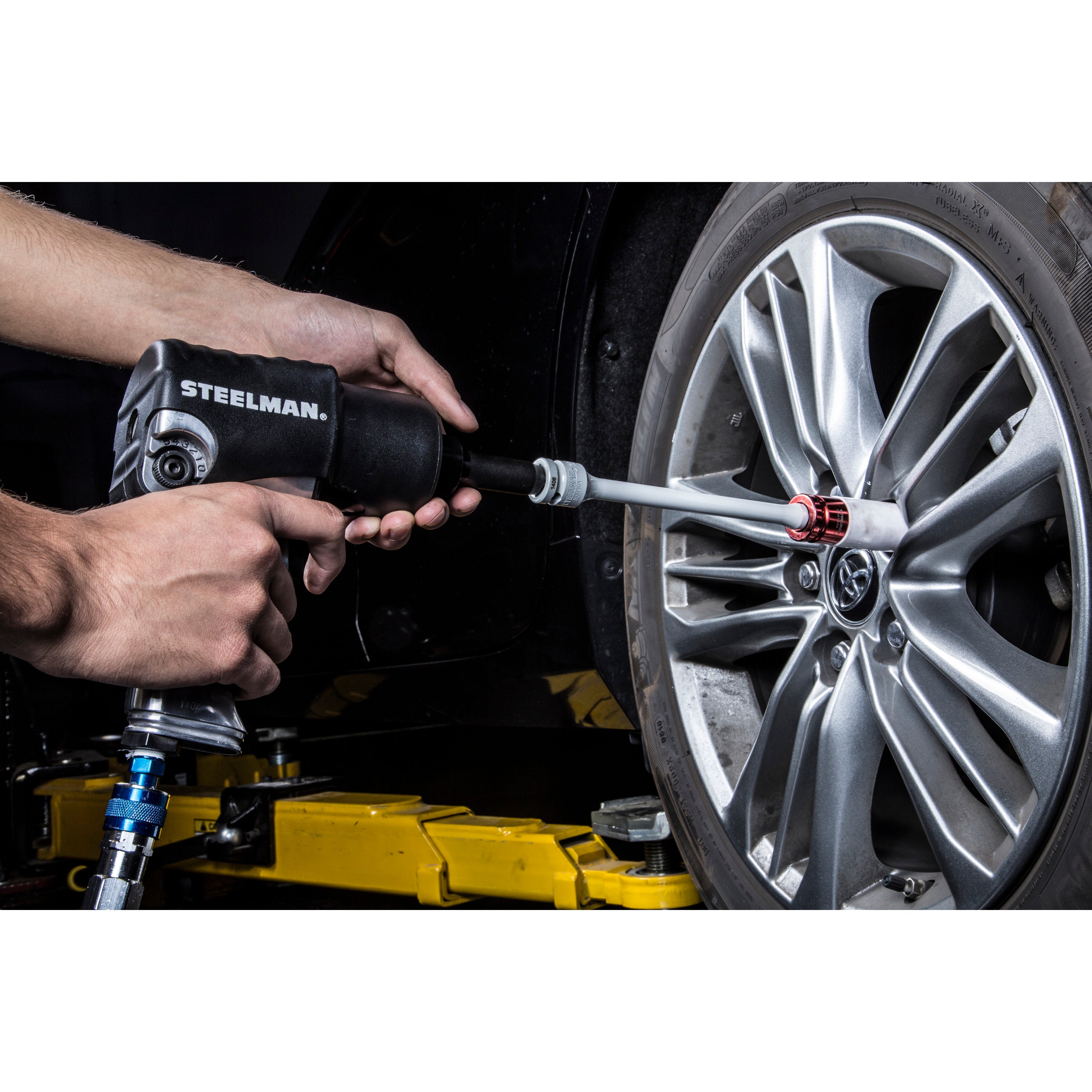 Protect your wheels, wheel studs, and brake rotors with STEELMAN torque extensions. The STEELMAN 50090A 1/2-Inch Drive Gray 100 ft-lb Torque Extension is designed to prevent damage to wheels, studs, and brake rotors by reducing the risk of overtightening lug nuts which can result in sheared stud bolts, rounded lug nuts, and warped rotors. This 8-inch extension bar will, when used with an electric or pneumatic impact wrench, limit the effective output of the wrench to 100 ft-lb of torque and anything above that will cause the extension to flex and absorb the extra impact. This torque stick is made of resilient chrome molybdenum (Chromoly) steel that has a gray powder coat to make it easy to pick out among other tools or in a crowded toolbox.