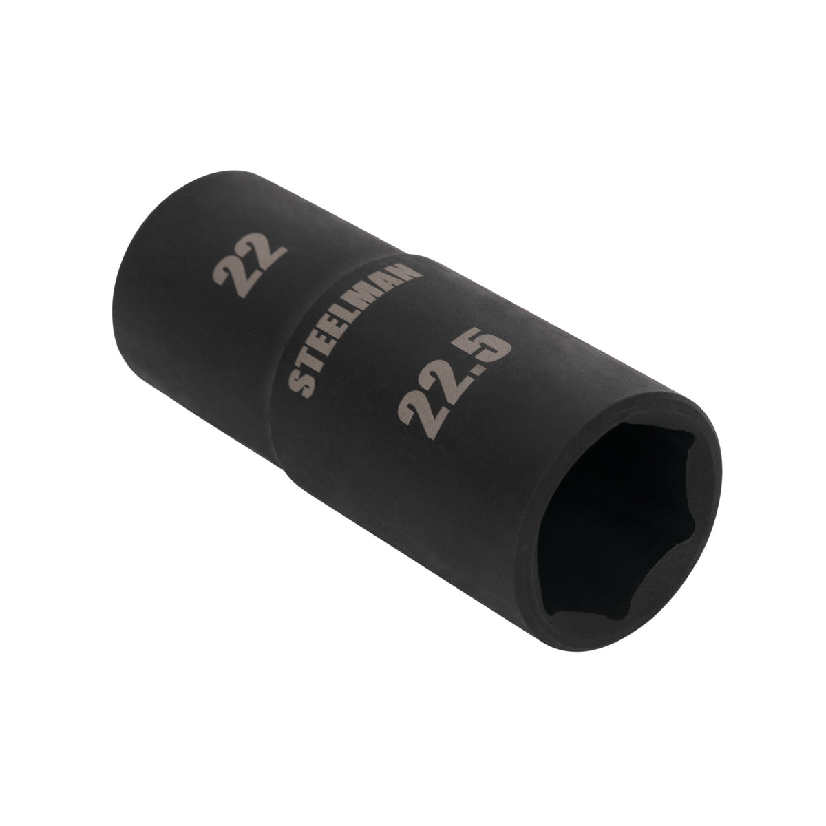 The STEELMAN 60231 1/2-Inch Drive 6-Point Thin-Wall Impact Flip Socket, 22mm x 22.5mm was designed to save you time by maximizing efficiency. This dual-ended, 6-point metric impact grade flip socket allows you to work on both 22mm and 22.5mm lug nuts and fasteners without having to constantly switch sockets. Made of durable and hardened chromoly steel which is then given a black phosphate protective coating, this socket is designed to meet or exceed 150% proof of torque under ASME tool performance testing standards. Fitting easily over an impact extension or onto an impact wrench's extended anvil, this socket's recessed edges provide the most accurate fit possible, gripping fasteners by the sides and not the edges which results in reduced slippage and rounding/fastener damage. In addition, the thin-walled design allows this socket to reach fasteners where there is less side clearance. Laser-etched size callouts make identification among other sockets easy. Whether you’re a professional mechanic at a repair or tire shop, or just love to work on your own cars and vehicles, this flip impact socket set is a must for working efficiently!