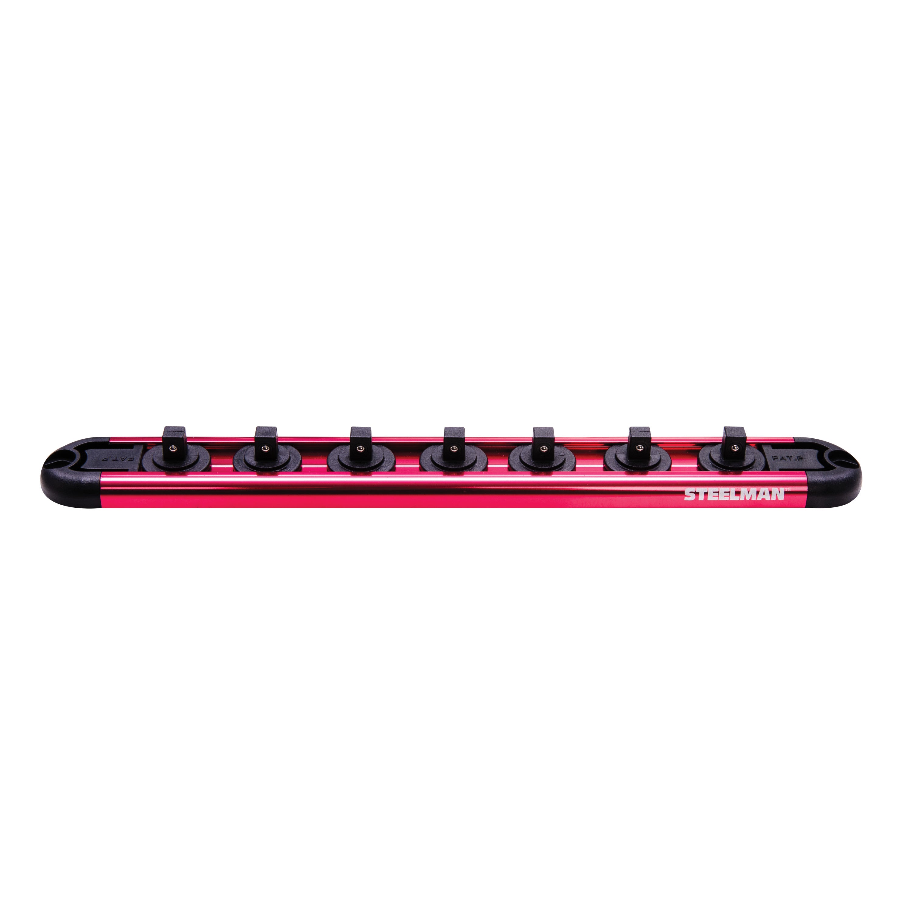 Bring some organization to your tool box and securely store and arrange your most commonly used standard (SAE) and metric sockets with the STEELMAN 60735 9.25-Inch Long 1/4-Inch Drive 7-Piece Aluminum Socket Storage Rail. Made with a lightweight aluminum spine and durable black ABS plastic clips, this rail allows you to easily store up to seven sockets. The back of the red anodized aluminum rail has a magnetic strip that allows it to remain stationary inside of metal tool chest drawers and atop tool carts without sliding around and can even be used for vertical storage, attaching to the outside of tool boxes when loaded with smaller sockets. The clips each have a spring loaded detent ball to firmly latch into and hold sockets until they are needed. The base of each clip is circular and easily rotated to make identifying stored sockets easier than with fixed slips. Clips can also be removed to make room for larger sockets or to create a custom socket holder that fits into most tool bags and say goodbye to disorganized sockets. Designed for use with STEELMAN 78520 7-Piece 1/4-Inch Drive SAE Chrome Deep Well Socket Set, but is compatible with any brand and type of 1/4-inch drive socket.