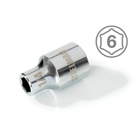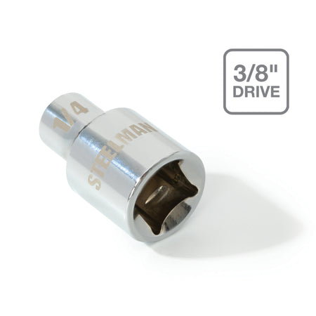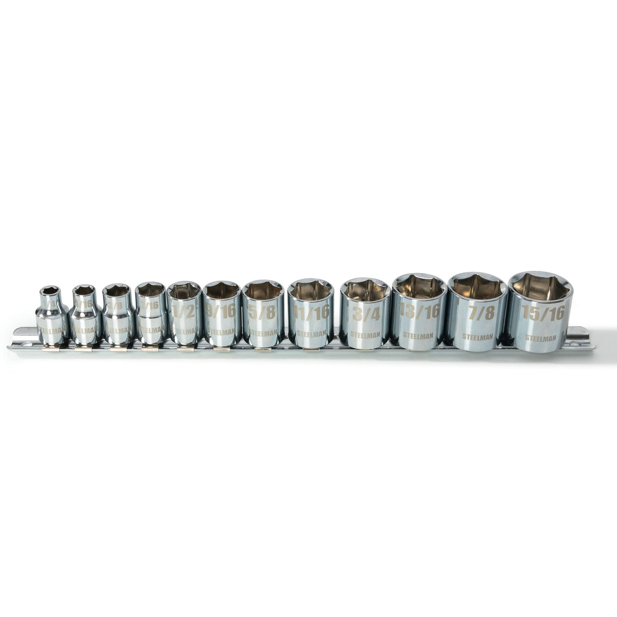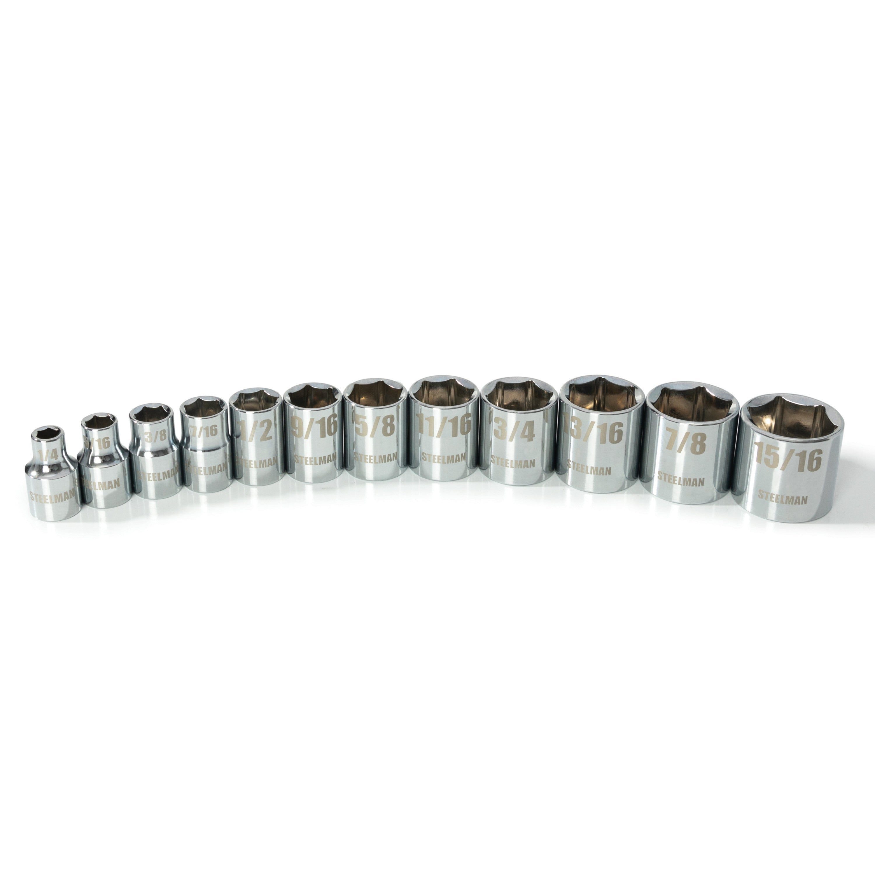 If you need a set of sockets you can depend on, be sure to find a home in your tool box for the STEELMAN 78201 12-Piece 3/8-Inch Drive Shallow 6-Point SAE Socket Set. Constructed of durable heavy-duty chrome vanadium steel, these sockets have the strength required for high torque jobs and will fit onto any 3/8-inch drive ratchet, torque wrench, extension bar, or adapter. The sockets all feature a rust and corrosion resistant high polish chrome finish that not only looks good but is easy to wipe clean of dirt, oil, and grime. The socket's 6-point design grips the sides of fasteners and not the corners, reducing wear and the chance of slippage or rounding the fastener. Easy to read size markings are laser etched onto the steel making it simple to identify the socket you need without the worry that the markings will wear away or rub off with use. Set includes the following SAE / standard sizes: 1/4-inch, 5/16-inch, 3/8-inch, 7/16-inch, 1/2-inch, 9/16-inch, 5/8-inch, 11/16-inch, 3/4-inch, 13/16-inch, 7/8-inch, and 15/16-inch. Rated to meet or exceed ANSI / ASME performance requirements for hand tools, these can handle tough use in any professional or home shop / garage.