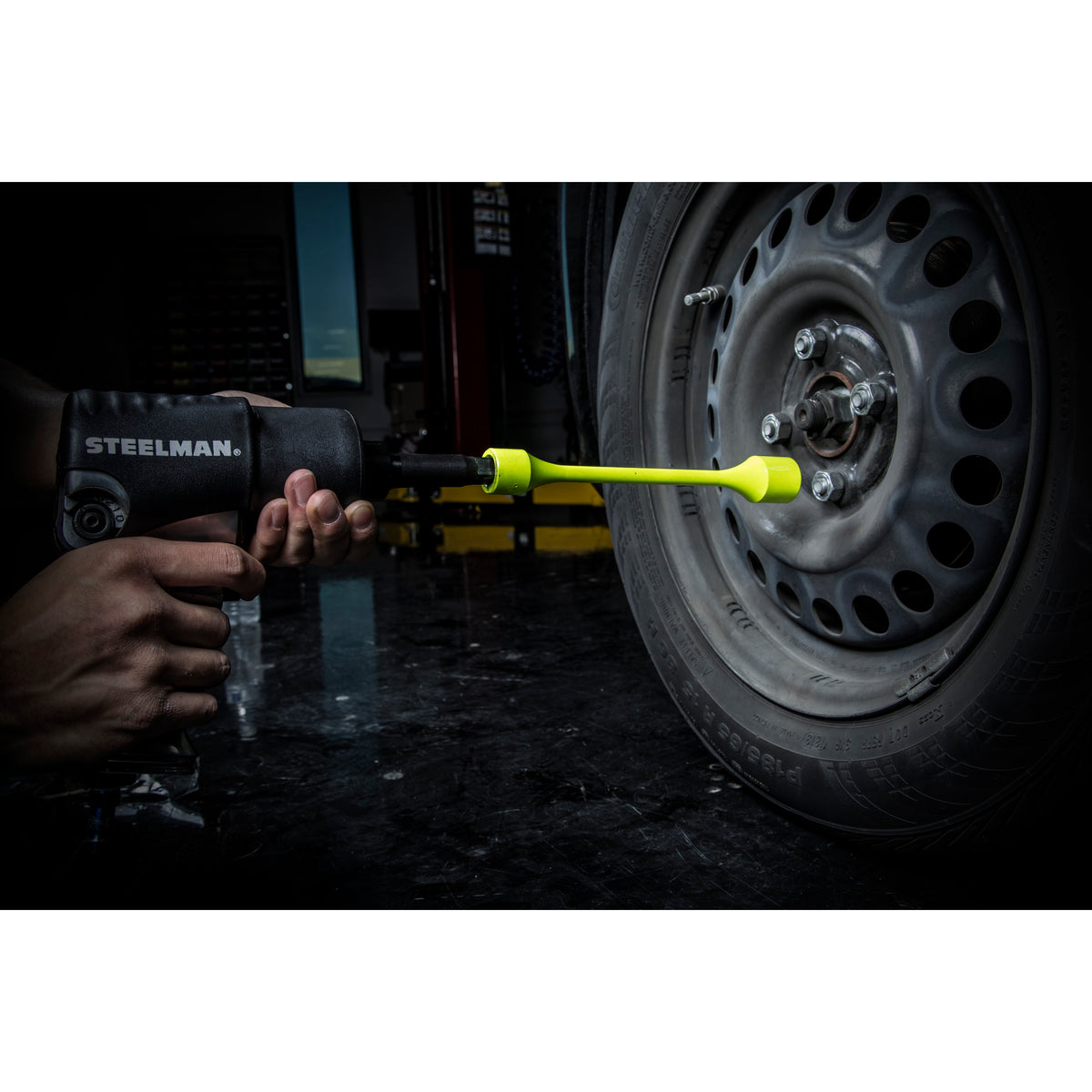 Protect your wheels, wheel studs, and brake rotors with this STEELMAN torque stick. The STEELMAN 50058 1/2-Inch Drive x 13/16-Inch 75 ft-lb Torque Stick is designed to prevent damage to wheels, studs, and brake rotors by reducing the risk of over-tightening lug nuts which can result in sheared stud bolts, rounded lug nuts, and warped rotors. This stick measures 8-5/8-inches long and has a 13/16-inch socket on the end. It will, when used with an electric or pneumatic impact wrench, limit the effective output of the wrench to 75 (102 Newton-meters) ft-lb of torque and anything above that will cause the extension to flex and absorb the extra impact. This torque stick is made of resilient chrome molybdenum (Chromoly) steel that has a neon yellow powder coat to make it easy to pick out among other tools or in a crowded toolbox.