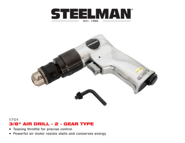 The STEELMAN 3/8-Inch Air Drill with Handle Exhaust is perfect for drilling, honing, reaming, and fastening. Exhaust is vented back out the handle and away from your face and work project. The heavy duty 3/8-inch keyed chuck can use a wide variety of bits and drivers to fulfil a wide range of roles. Weighing in at 2.5 pounds and only 6.5-inches in length, this powerful pneumatic tool delivers a free running speed of 2,200 RPM with a trigger style variable speed throttle letting you determine how much power you need. Operating on a mere 4 cubic feet per minute of 90 PSI compressed air delivered through a standard 1/4-inch NPT inlet and 3/8-inch air hose this tool is ideal for all your medium to heavy-duty drilling tasks.