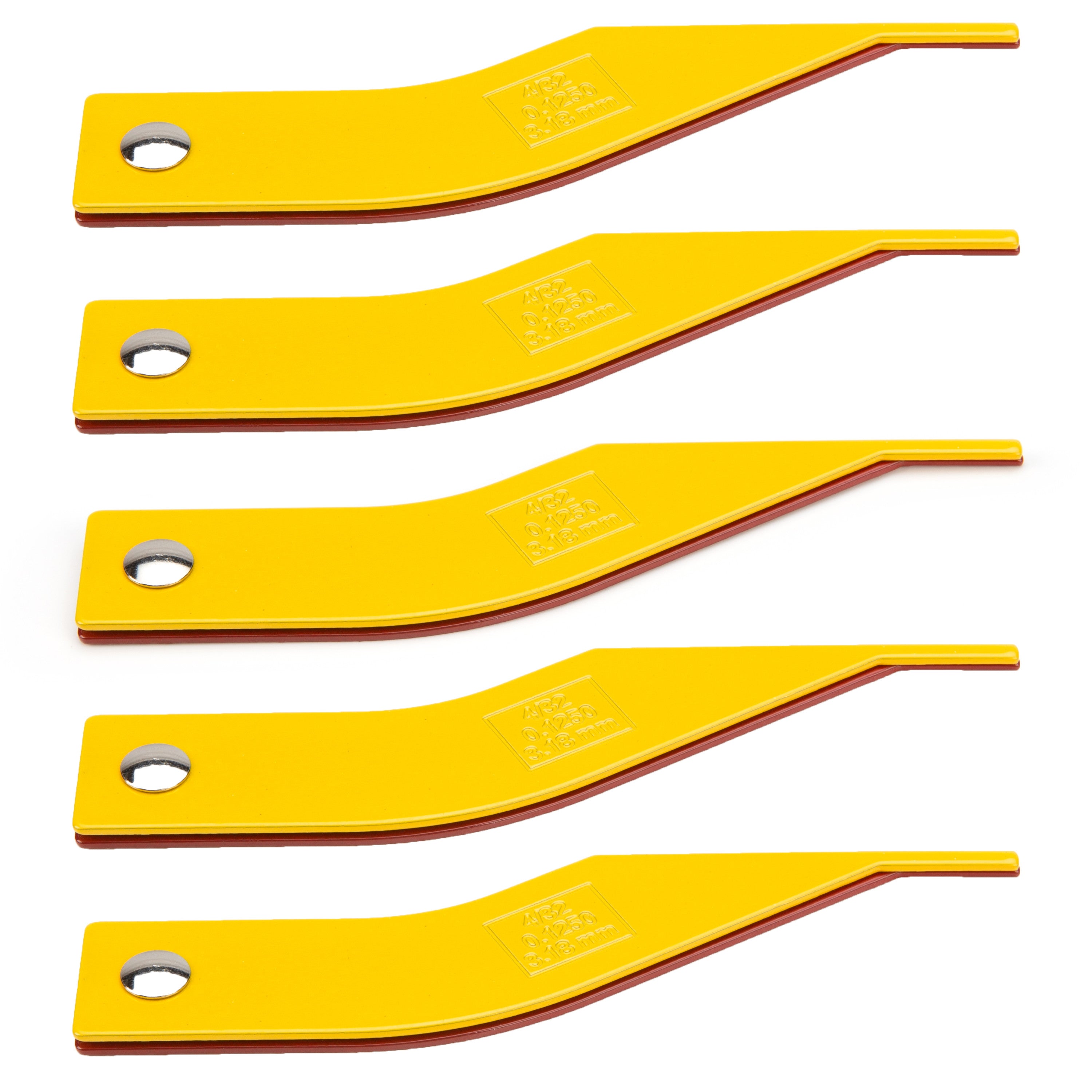 The STEELMAN 97845 2-Piece Brake Lining Thickness Gauge Set, 5-Pack is perfect use for both in the professional garage / workshop and or for the DIY home mechanic who wishes to have a set on hand in multiple locations. Suitable for use on both disc and drum brakes, these durable steel measurement tools are color coded to give a quick reference point on the status of your brake pads. The long measuring blade tips can fit into spaces most digital micrometers and calipers cannot. Each blade has its size stamped into the metal in metric as well as fractional and decimal SAE scale so you can tell at a glance the amount of pad you have left. The yellow blade tip measures 4/32-inch (3.18mm) and the red blade tip measures 2/32-inch (1.59mm).