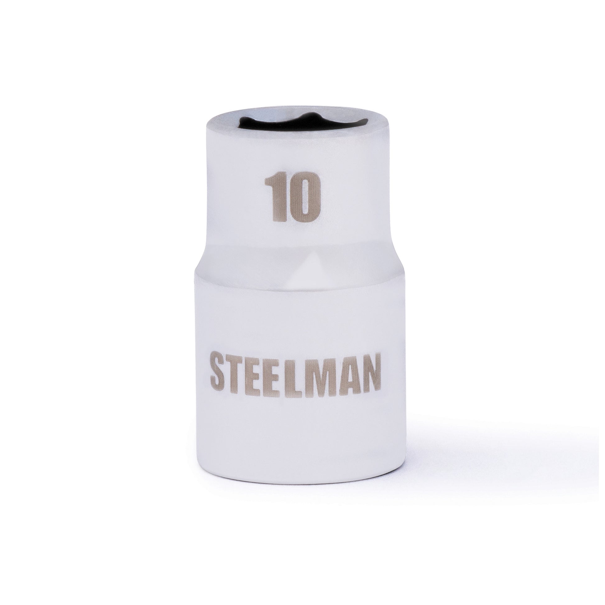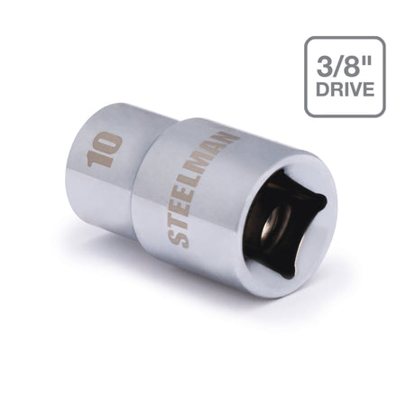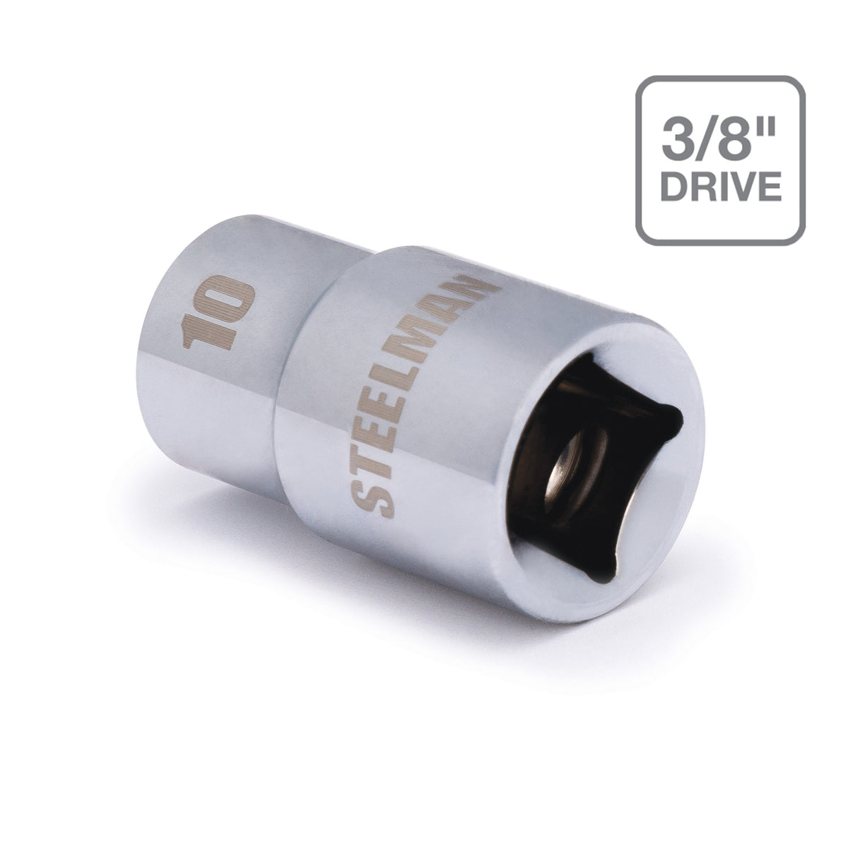 If you need a socket you can depend on, be sure to find a home in your tool box for the STEELMAN 78193 3/8-Inch Drive x 10mm Shallow 6-Point Metric Socket. Constructed of durable heavy-duty chrome vanadium steel, this socket has the strength required for high torque jobs and will fit onto any 3/8-inch drive ratchet, torque wrench, extension bar, or adapter. The socket features a rust and corrosion resistant high polish chrome finish that not only looks good but is easy to wipe clean of dirt, oil, and grime. The socket's 6-point design grips the sides of fasteners and not the corners, reducing wear and the chance of slippage or rounding the fastener. Easy to read size markings are laser etched onto the steel making it simple to identify the socket you need without the worry that the markings will wear away or rub off with use. Rated to meet or exceed ANSI / ASME performance requirements for hand tools, this socket can handle tough use, whether it is in professional garage fixing car engines or at home repairing furniture and appliances.