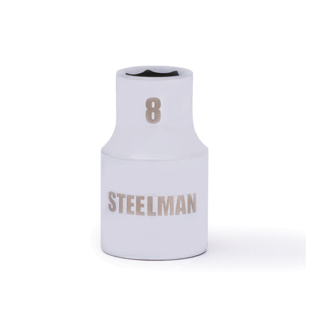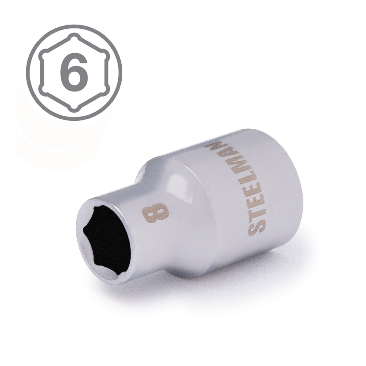 If you need a socket you can depend on, be sure to find a home in your tool box for the STEELMAN 78191 3/8-Inch Drive x 8mm Shallow 6-Point Metric Socket. Constructed of durable heavy-duty chrome vanadium steel, this socket has the strength required for high torque jobs and will fit onto any 3/8-inch drive ratchet, torque wrench, extension bar, or adapter. The socket features a rust and corrosion resistant high polish chrome finish that not only looks good but is easy to wipe clean of dirt, oil, and grime. The socket's 6-point design grips the sides of fasteners and not the corners, reducing wear and the chance of slippage or rounding the fastener. Easy to read size markings are laser etched onto the steel making it simple to identify the socket you need without the worry that the markings will wear away or rub off with use. Rated to meet or exceed ANSI / ASME performance requirements for hand tools, this socket can handle tough use, whether it is in professional garage fixing car engines or at home repairing furniture and appliances.