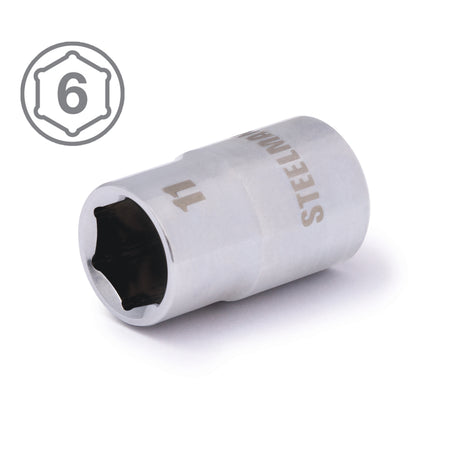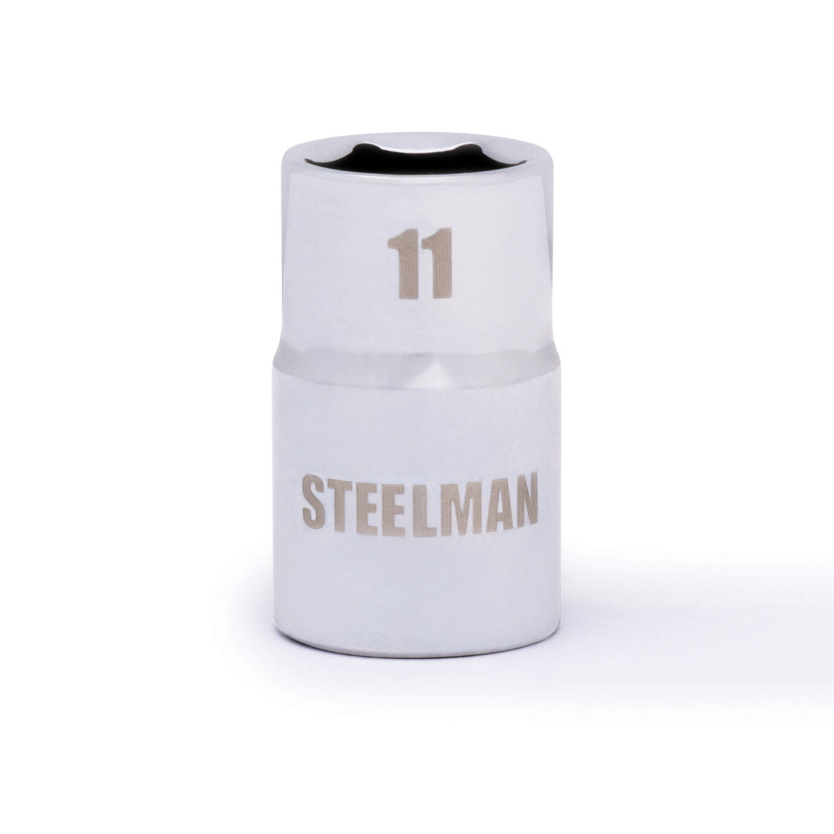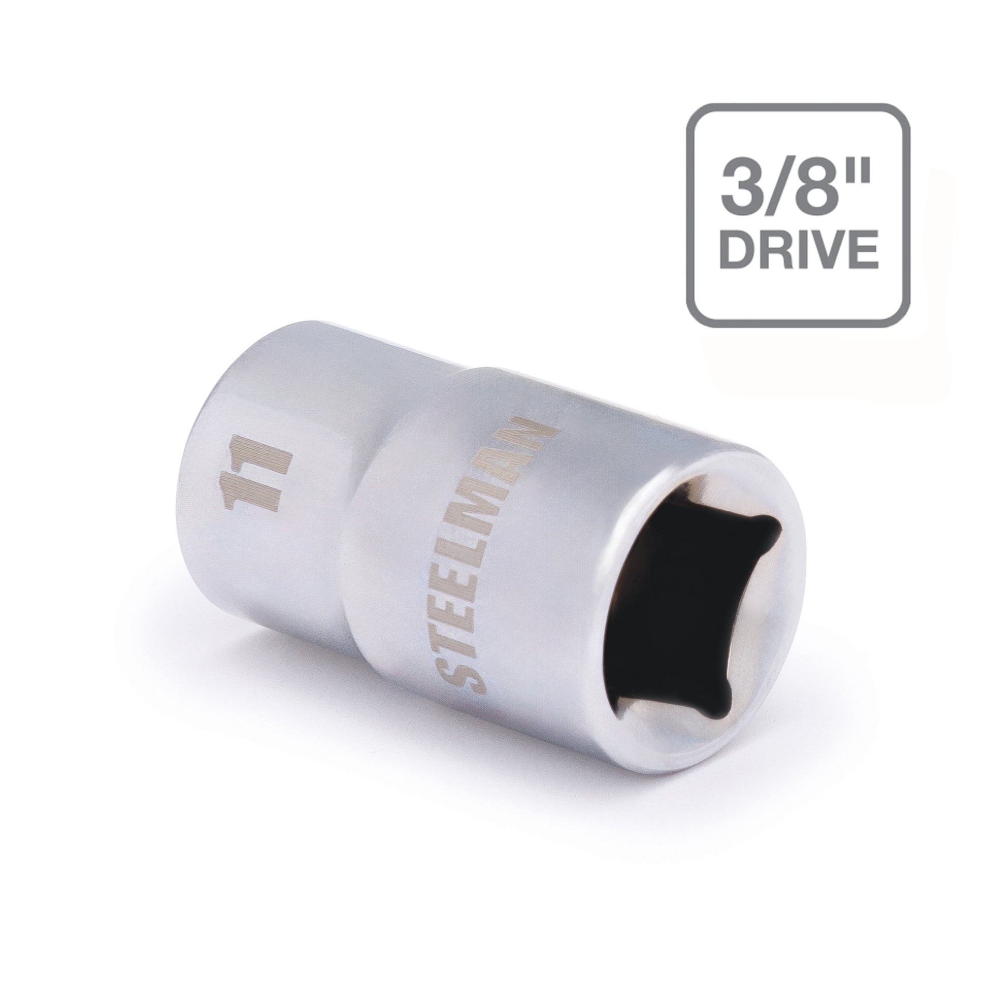 If you need a socket you can depend on, be sure to find a home in your tool box for the STEELMAN 78194 3/8-Inch Drive x 11mm Shallow 6-Point Metric Socket. Constructed of durable heavy-duty chrome vanadium steel, this socket has the strength required for high torque jobs and will fit onto any 3/8-inch drive ratchet, torque wrench, extension bar, or adapter. The socket features a rust and corrosion resistant high polish chrome finish that not only looks good but is easy to wipe clean of dirt, oil, and grime. The socket's 6-point design grips the sides of fasteners and not the corners, reducing wear and the chance of slippage or rounding the fastener. Easy to read size markings are laser etched onto the steel making it simple to identify the socket you need without the worry that the markings will wear away or rub off with use. Rated to meet or exceed ANSI / ASME performance requirements for hand tools, this socket can handle tough use, whether it is in professional garage fixing car engines or at home repairing furniture and appliances.