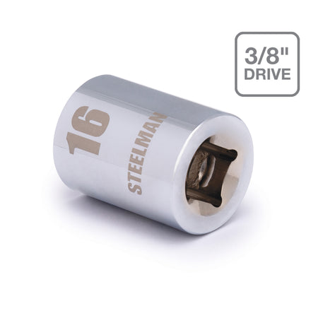 If you need a socket you can depend on, be sure to find a home in your tool box for the STEELMAN 78425 3/8-Inch Drive x 16mm 6-Point Metric Socket. Constructed of heavy-duty heat-treated chrome vanadium steel, this shallow access socket has the strength required for high torque jobs and will fit onto any 3/8-inch drive ratchet, torque wrench, extension bar, or adapter. The socket features a rust and corrosion resistant high polish chrome finish that not only looks good but is easy to wipe clean of dirt, oil, and grime. The socket's 6-point design grips the sides of fasteners and not the corners, reducing wear and the chance of slippage or rounding the fastener. Easy to read size markings are laser etched onto the steel making it simple to identify the socket you need without the worry that the markings will wear away or rub off with use. Rated to meet or exceed ANSI / ASME performance requirements for hand tools, this socket can handle tough use, whether it is in professional garage fixing car engines or at home repairing furniture and appliances.