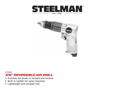 The STEELMAN 3/8-Inch Reversible Air drill is perfect for drilling, honing, reaming, and fastening. A thumb operated switch lets you easily reverse direction without removing your hand from the tool. A built-in muffler helps reduce operating noise and internally redirected exhaust vents back out the handle and away from your face and work project. The 3/8-inch keyed chuck can use a wide variety of bits and drivers to fulfil a wide range of roles. Weighing in at 2.7 pounds and only 6.5-inches in length, this pneumatic tool delivers a free running speed of 1,800 RPM with a trigger style variable speed throttle letting you determine how much power you need. Operating on a mere 4 cubic feet per minute of compressed air delivered through a standard 1/4-inch NPT inlet and 3/8-inch air hose this tool is ideal for all your light to medium-duty drilling tasks.