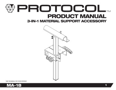The PROTOCOL Equipment MA-18 (92782) 3-in-1 Adjustable Height Material Support Accessory was designed to bring added versatility to your PROTOCOL miter stands as an upgraded replacement of the base material supports. Constructed of sturdy galvanized steel with a powder-coated finish for added durability, this support features an 18-inch long riser that allows for a greater range of height adjustment compared to most default supports. It also features an adjustable multiple clamp mounting bracket that allows it to convert a regular sawhorse or 2x4 into a functional material support. The 6-inch wide, polished steel head features a lower 90-degree steel lip for fixed-length material stop cuts. Works on most makes and models of miter saw stands as an upgrade or replacement and the adjustable mounting bracket fits easily onto PROTOCOL SH-042 and SH-047 folding sawhorses.