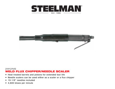 Remove rust, mill and flux scale, old paint, and more from metal surfaces when doing body and finishing work with the STEELMAN 29121NS Pneumatic Needle Scaler and Flux Chipper. This 18-inch long tool weights in at 6.65-pounds and conceals inside a powerful pneumatic motor capable of delivering 4,600 blows per minute (BPM). The barrel and interior pistons are made of heat treated steel for long lasting durability and operational life as they drive the nineteen (19) 1/8-inch diameter needles to remove old finishes and reveal the pristine metal beneath. The handle's air inlet is threaded to accept 1/4-inch NPT quick connect fittings and adapters for easy connection to existing shop pneumatic air delivery systems. Energy efficient, this air hammer operates on 4 CFM of compressed air at 90 PSI. So whether you need to remove scale prior to welding, strip paint before body work, or any similar job, STEELMAN tools will help you work smarter and faster.