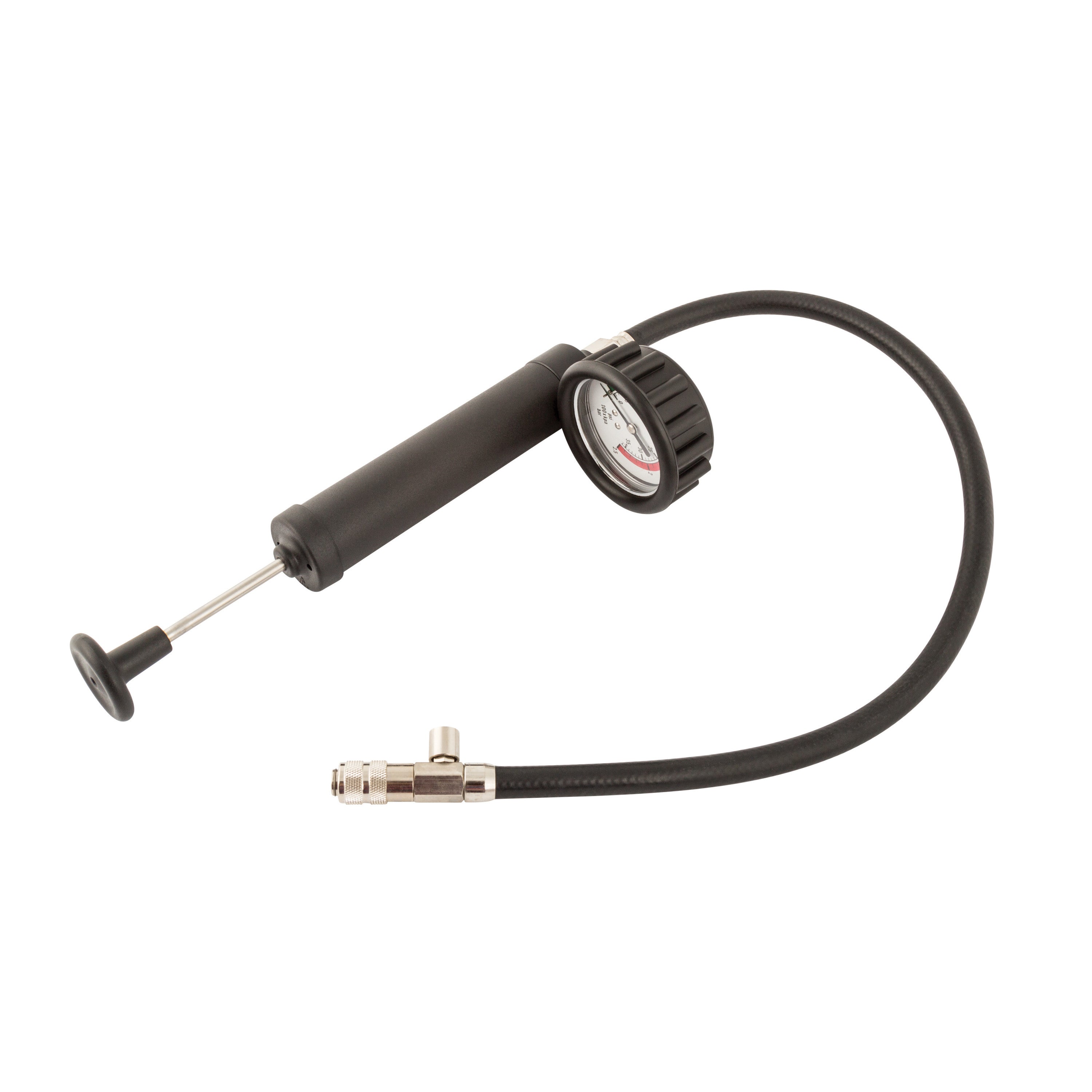 Replace a lost or damaged pressure pump assembly with the STEELMAN 60401 Replacement Pressure Pump and Hose Assembly. This hand operated pump can provide test pressures ranging from 0 to 36 PSI (10-200 kPa) and has an attached 21-1/16-inch (53.5cm) hose with a pre-attached quick-disconnect coupler and button operated pressure relief valve. The attached dial gauge is large and easy to read with both 0-36 PSI and 0-2.5 Bar / 0-250 kPa scales clearly marked. The tool features a durable nylon casing and a shock-resistant protective rubber boot around the gauge to prevent damage from accidental bumps and knocks during use. For use with the STEELMAN 60025 Master Cooling System Test and Purge Kit.