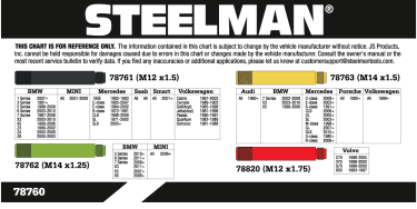 Save time and work more efficiently with the STEELMAN 78760 8-Piece Wheel Hanger Set. This handy kit features eight wheel hangers ideal for changing wheels on European vehicles that use lug bolts instead of studs and lug nuts. Prevent painful back strain caused from trying to hold a heavy wheel and tire in place while fumbling to get a lug bolt started to take away the load. Each tool is constructed of durable anodized aluminum and designed to fit through the wheel's existing lug holes to allow easy, stress free tire mounting. Color coded for easy identification each hanger features a different thread size allowing the kit to be used on select makes and models from BMW, Mini, Mercedes, Saab, Smart, Volkswagen, Audi, Porsche, and Volvo. The black hanger measures 12.6mm (0.495-inch) in diameter and has an M12 x 1.5 thread while the other hangers measure 15mm (0.588-inch) in diameter and feature the following thread sizes: Gold M14 x 1.5, Green M14 x 1.25, and Red M12 x 1.75. The hangers can also be used to prevent accidental damage when removing your wheels. Set comes with a convenient blow-molded plastic storage case which features a handy quick-reference insert to help identify the correct hanger for your vehicle.